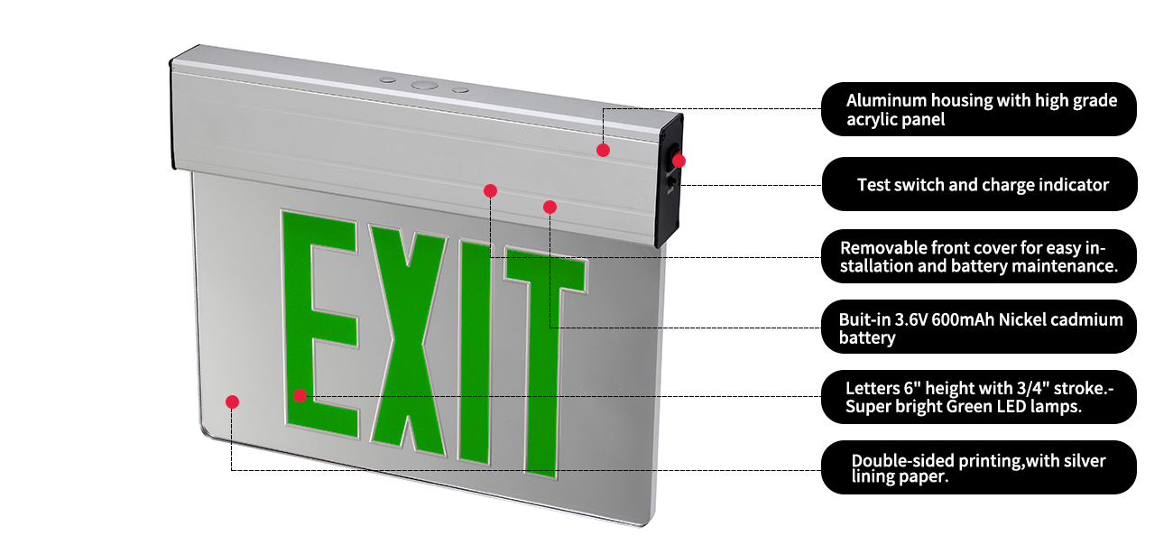 * Illumination - Hoc Edge Litt Exitus Sign Series praebet diu vitae ducitur illuminatio. Quod unitas construitur cum viridis excelsum output duxit tabula.  Energy consummatio est rated ad minus quam III watts pro ac solum exemplar unitates. Pugna tergum unitates industria consummatio est rated ad minus quam I watts.